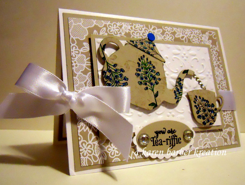 The SUO challenge blog is challenging us with something that makes you think of winter. HOT DRINKS make me think of winter, and in this case in particular, HOT TEA. Can I also just brag for a moment? Last time we were supposed to post which was two weeks ago, I found myself locked out of my blog. I could not get in to post – I have always had to go between my gmail and yahoo email accounts when I wanted to post and suddenly I could not log off gmail to log onto yahoo and create a post. I need to brag because I FIXED It ALL BY MYSELF!!! I am slightly challenged in these things and I still can’t believe I managed to just download a new browser after my friend Julie Gearinger sent me a link that might explain what was going on. 🙂 YAY!! There is nothing as frustrating than computer problems, well, maybe there are things more frustrating but I can’t think of any right now. So I missed one post but here I am back again! Happy New Year everyone!!! Until next time……Karen