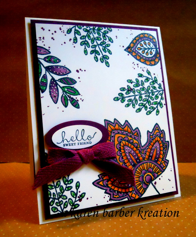 SO……who knew it would take me THIS LONG to get back into the swing of things??? It’s been over a month since my last blog entry…..and we have been in our new house since JULY 25TH…..and it’s now AUGUST 31ST…..and I am FINALLY posting!! SUO challenge this week is “Thinking of You/Friendship” – so I gave this new leaf set a try…..This is the first card I made in my new stamp room, which is a make shift one because we are actually going to build one in the basement….but have all kinds of other projects that trump that one, like getting my mother moved in for one!! We hit the ground running – redoing the kitchen, family room and dining room which all needed it pretty badly. We opted to use one of those kits where you do about 7 steps to every cabinet and then to the boxes, drawers, doors, etc. Can I just warn you that you need to reeeeeallllllly hate your existing cabinets before attempting this???? And can I tell you don’t complain that your kitchen is too small cuz after you get going, mark my words you will wish it was SMALLER!!! My heavens, it is taking for evah…….and I fear we will still be at it by Christmas!!!! We hung the first completed row tonite and they make me wanna cry they look so pretty……(in a happy tears sort of way) but Oh my STARS is this labor intensive!!!!! I know in the end it will be worth it, but what a JOB!!! We get new granite countertops installed on October 1st and new back splash of subway tile shortly after…..and we are also pulling up carpeting in 3 rooms and laying down bamboo flooring……gahhhhh……I am too OLD for this!!!!! We are actually having fun doing it…..or at least we keep telling ourselves that we are….bahahaha. My husband keeps saying this is the last move for us, ever – he keeps saying the next move for him will be out on a stretcher when he dies in this house……hahahaha. We thought that with the last house….so never say never honey. hahahaha…..if you don’t laugh you will CRY. Anyway- I will post some before and after kitchen pics when we are all done…….and like i said, if you are considering painting and refinishing kitchen cabinets……well……consider it verrrrrrrry carefully before starting. Cuz once you start there is no turning back. Here’s to a beautiful kitchen, and here’s to the first card I finally stamped in my new house. God is good, all the time. All the time, God is good, even when you are on door number 28. Oh yah. Until next time………Karen