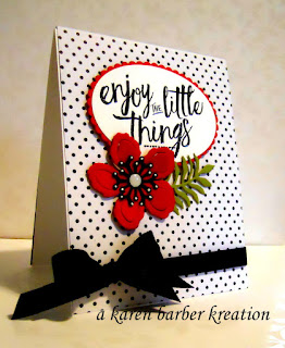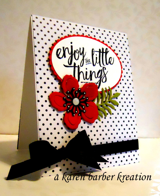 The SUO challenge blog this week is to make a card that’s black and white with a POP of some other color. Classic. One of my all time favorite color combos is black, white, and a POP of RED. Not just ANY red, REAL RED. 🙂 And this die set is still one of my most favorite even after the release of the new catalog, with all that stellar new stuff! Black and white polka dots are always right, no matter what the occasion. And can’t we all learn from this awesome new sentiment? Enjoy the little things, because some day you will realize they are the BIG things!! Happy Tuesday everyone, and Happy Stamping!!~~ Until next time, Karen