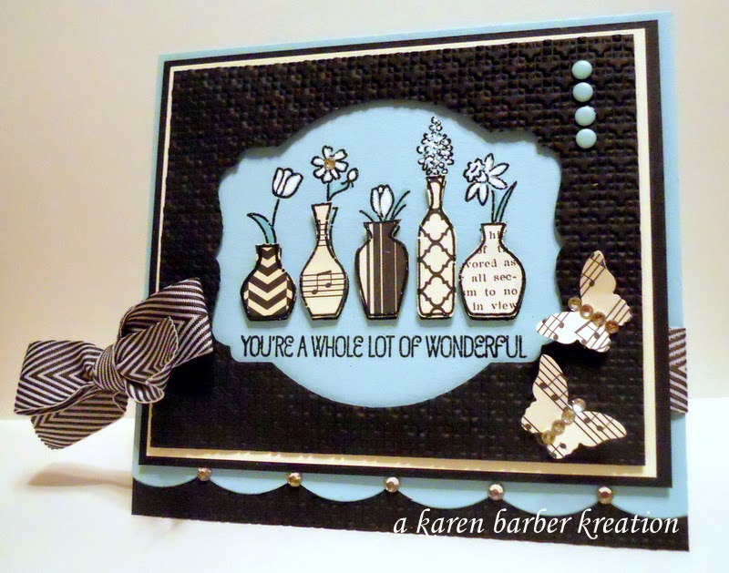 The SUO challenge blog for today is Butterflies, Birds, etc – and the color challenge is Pool Party, Basic Black and Whisper White.  I used Very Vanilla as my added neutral.  The colors scared me at first, but ended up being very easy to put together, and quite beautiful I think! I love the Modern Medley dsp’s, and I love paper piecing! 😉 I am up way past my bedtime, so I am off to bed, Happy Tuesday everyone!! Until next time, Karen