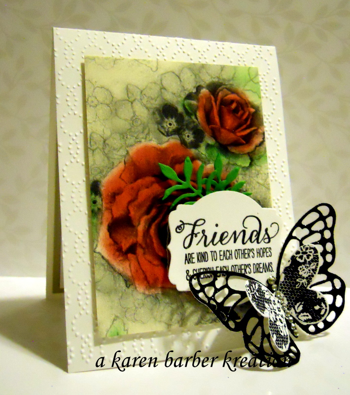 The SUO challenge blog this week is challenging us to use retired dsp, or cardstock. I have used both the Timeless Elegance dsp AND the shimmery black paper which is also retired. This might be my all time favorite dsp from SU in the history of ever. SO elegant!! I also created this for the color challenge this week which is real red, cucumber crush, and sahara sand. And the dessert is a picnic. What picnic is complete without a butterfly or two fluttering by?? Well, anyway, this is my card that meets both! I have been busily helping my husband who is recovering from rotator cuff surgery and I haven’t had a lot of time for stamping…..hard to believe it’s time for another out with the old and in with the new season!! Happy Stamping everyone!!