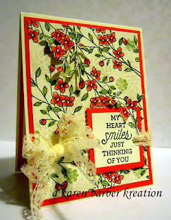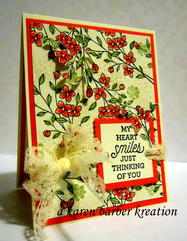 The SUO challenge this week is to use your favorite new die cuts – and I have to say, though I LOVE all the fancy ones, my heart is happy because we FINALLY go layering shapes – ovals, squares, circles, hearts. We just NEEEEEEEDED them. Now if we can just get some edglets back. 🙂 To make this card I filled my aqua painter with alcohol and used reinkers of peek a boo peach, watermelon wonder and pear pizazz to watercolor these sweet posies from one of my favorite new stamp sets, Touches of Texture. This is such an awesome technique to use for coloring because the paper doesn’t pill and you can use regular weight cardstock! I also used this same card for the color challenge over on SCS this week, and I used the same sentiment stamp I did last week. Haha. I sound like I so when I wear the same outfit on Monday that I wore on Sunday to church. Like anyone except me really cares. Haha. So egotistical to think they would even REMEMBER what I wore the day before if I happened to run tinot a church friend at work, which I never do. HAHA. I am tired. Can you tell?? Getting a little punchy here. Nite all, Happy Stamping and Happy Tuesday!! Until next time, when I promise to change up the sentiment, Karen