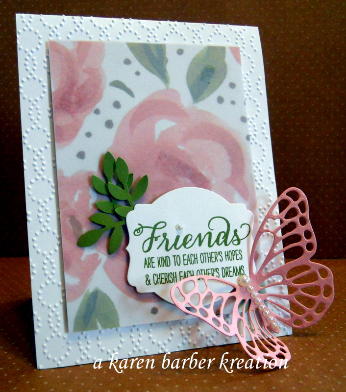 The SUO challenge this week is for designer paper…..and SU has some awesome new ones!! I used my favorite new one, which is English Garden…..so many pretty choices! I used my two favorites in that package, and I just covered them with a piece of vellum the same size to give them a more muted look. Owl punch for some leaves, chalk talk framelets for the words and the butterfly die – voila!! Quick, clean, and classy! And since we are deep in the midst of packing up our house to move on July 25th, quick and clean and classy is about all I can eek out right now!! Stampers withdrawal!!! I have spent so much time packing up my beloved stamp studio, and have to start all over in the new house as my husband will be building me a new one in the basement – going to be a huge challenge!!! So much of life is letting go of things we love to embrace new ones, isn’t it? A lesson to never hold on too tightly to “things” – things are things and a house is a house but the people in it make it a home, and I am sure I will love my new home soon enough. I have walked in circles in my present home, boxes everywhere, realizing a chapter in our lives is coming to an end. No more Christmas’s here with the laughter of grandchildren, no more picnics, no more hot tub, no more, no more, no more. But the new house will bring it’s own memories over the next few years. Before long, it will be home sweet home. Time marches on, and as followers of God He sometimes asks us to do the unexpected. And if we do it, blessings follow. Praise God from whom all blessings flow! Like new houses, and new places to rest our weary heads. God is good all the time. All the time, God is good. Until next time, Karen PS – 28 comments surely made me feel like someone reads this thing!! I didn’t mean to sound like a whiner, but 1 comment, 2 comments, 1 comment week after week really did have me wondering. If you enjoy this – please continue to just leave me some love. Means the WORLD to me…..and keeps me blogging. 🙂
