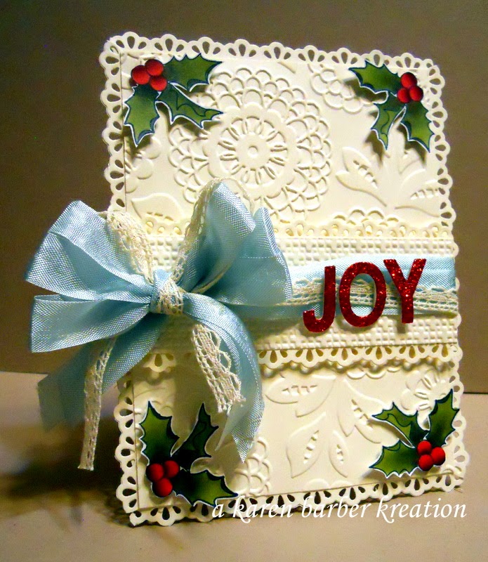 Love, love, love it, Karen! This card is absolutely gorgeous. The colors, the coloring, the ribbons, the texture, the JOY….it's all 'yummy'! Blessings to you and all of yours this Christmas.