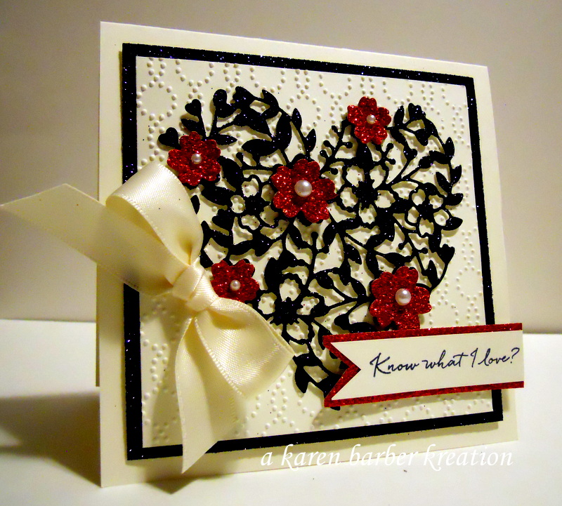 The SUO challenge blog this week features a valentine. This die has to be one of the most elegant things SU has given us in a loooonnnnng time!! I used the glittery papers on top of very vanilla….a very elegant look if I do say so myself!! I just love this card. I love the sentiment which comes from a saleabration set this year -Know what I love? You. HOW SWEET IS THAT? This was a super quick card to make – and I think I can even call is CAS, yes? CAS is the biggest style struggle for me evah…..but SU made it easy with this die! This die is to die for!!! I think you NEEEEEED one! Don’t you?? Happy Tuesday everyone!! Happy Stamping! Early Happy Valentines Day!! Until next time…….Karen