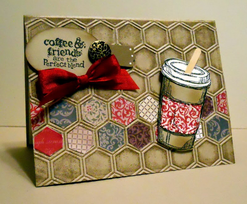 The SUO challenge for today was “Something Yummy” – and I found the idea for this awesome background here:  http://talesfrommary.blogspot.ca/2013/01/frigid-weather-hot-soup-and-some-fun.html  You need to scroll down a little but you will see where I got my idea from this blog, Tales from Mary…. I did put my own slant on it, i.e., I did not layer it, I did my own thing with embellishing the top, and I added, “Something Yummy” to the top.  I thought this was one of the coolest backgrounds EVER.  About a year ago, I lost 30 pounds, and I have managed to keep most of it OFF.  One of my favorite things has become my evening cup of decaf…..which sort of ends up being my dessert.  Who woulda thunk it??  I just love the Perfect Blend stamp set…..and I like to celebrate the stamps that DON’T get discontinued after that enormous list comes out every year….just to remind myself that not EVERYTHING is gone, thus, the coffee cup. 🙂 I’m rambling here, so I’m gonna ramble just a wee bit more and tell you, today was a bridal shower for my daughter who had the great sadness 2, 1/2 years ago when her marriage crumbled after her husband betrayed her.  I just need to say that HE makes all things beautiful in HIS time.  I was so blessed today at her bridal shower.  She gets married June 14th.  Part of the LOVELY wedding shower that Aaron’s church threw for them was a game they had, where they asked  Aaron a bunch of questions and he answered them and then they asked Bekah at the shower and they were going to see how many answers they agreed on, kinda like The Newlywed Game, though they aren’t married yet.  There were several chances for him to embarrass her in a cute way by the questions they asked.  In every instance he gave the sweet answer, always showing her good side – which endeared him to me even more.  “Who is Aaron’s celebrity crush?” was answered with “John Wayne” which cracked me UP, he wasn’t even going to put any woman above his wife to be.  So he answered it with humor.  God is good, I know with their little blended family the journey may be rocky at times, but they are God’s gift to each other, and I just know that HE has made beauty from ashes, once again, and I am forever thankful to our God, who knows our every need and makes all things beautiful in HIS time.  Happy Stamping everyone, and happy Tuesday!  Until next time, Karen