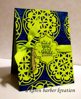 I LOVE the new Eastern Palace Suite that SU has made available THIS MONTH before the catalog goes live NEXT MONTH. The SUO challenge this week is a masculine card….and I think this would be a great card as a man-card….what do you think? On the other hand I would like to get it as a GIRL too, but it looks more manly than most of my cards…..I mean, there are NO FLOWERS, right? This new set with the dies and stamps is the BOMB, and this new lemon lime color knocks my socks off! We haven’t had a color like this in literally YEARS – in fact the last time we had one I was afraid of it….but this one I love, I guess I have gained color maturity over the years. At any rate I have started playing with this suite and have gotten almost NOTHING ELSE DONE FOR DAYS…..but for now I must lay my head upon my pillow and get some sleep as tomorrow I am going into work early. Happy Tuesday everyone! Until next time, Karen