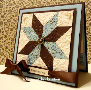 The theme for the SUO challenge today was supposed to be make the focal point of your card a punched image…..hmmm… I sorta made the focal point a bunch of little punched things,,,,,squares to be exact – one inch squares. You need four of the dp, 4 of the early espresso, and 8 of vanilla. Then you cut all but the 4 corner vanilla squares in half from point to point crosswise. Then you start in the middle of SU’s grid paper, and make your star by using the lines on the grid paper to keep things straight. Then you trim the edges, you have glued your quilt right down to the grid paper and you just cut the whole thing out. Then choose an embossing folder to run the whole thing thru your big shot and give it the quilted appearance. I used the wallpaper folder here, but the square lattice also works well, and so does the finial press. The first time I made one of these it was with a group of ladies I love from eastern Ohio, we stamped an entire weekend away, and this was the one card that tried our patience. Now after having done it a few times, I think, “Why did it seem so hard that first time???” Anyway- they are pretty fun to make and so cool looking when you get them finished. TRY one, when you feel patient and relaxed. Hopefully you will still feel that way when you are done! Happy Stamping!!! Until next time…..Karen