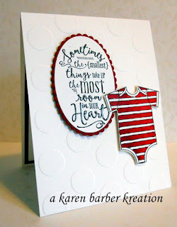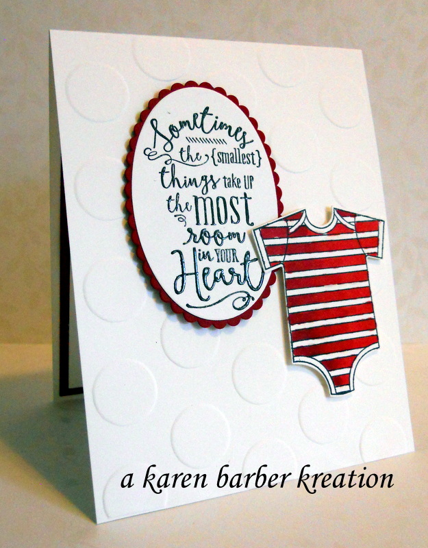 FOR GRANDCHILD #12, coming in OCTOBER!! The SUO challenge this week was PRIMARY COLORS, and I went with a monochromatic theme since I don’t think PRIMARY COLORS are SU’s long hand. I don’t really think we have a primary blue, or yellow, or orange, but we do have an awesome primary RED. 🙂 I’m very excited to welcome Grand child #12, but only GRANDSON number THREE. We are pretty used to GIRLS in this family. 😉 Speaking of grandchildren, we got to see almost everyone of ours during the month of August!! (missed you Mady and Chloe) but we got to see Ethan, and Kara, and Olivia, and Layla and Brooklyn, and Tovah and Lami, and Luca and Eva!! We went on a camping trip with most of them, and we just had a wonderful month of kids and grandkids. So lots of tears when it was all over. The house gets all meticulous again, but it also gets empty and lonely. The stray hair ties, and headbands and toys and socks, etc. each offer a stab through the old heart. And I always go back to my favorite saying, “Don’t cry cuz it’s over, SMILE cua it happened…..but truthfully, it ain’t easy. Until next time, Karen