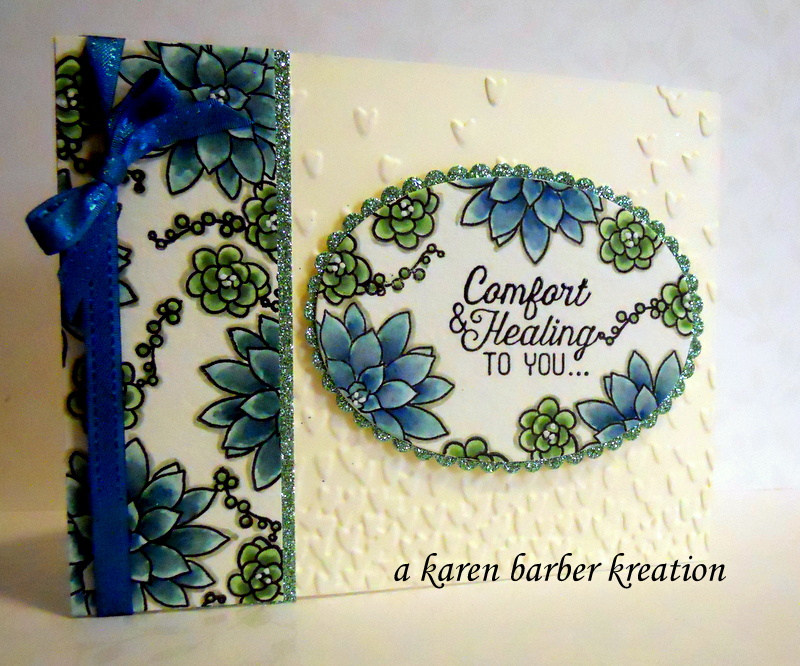 The SUO challenge for this week is to make a Sympathy card. I decided to play with this set again as I used it last week when I was hostess for the color challenge. I like this card, but not as much as the one I made last week. It’s a fun set though, if you like to color. 🙂 Succulents are crazy IN right now. What’s up with that? They’ve been around for 100’s of years but suddenly they are EVERYWHERE. Anyhow I hope you like my succulents. Happy Tuesday everyone!! Until next time, Karen