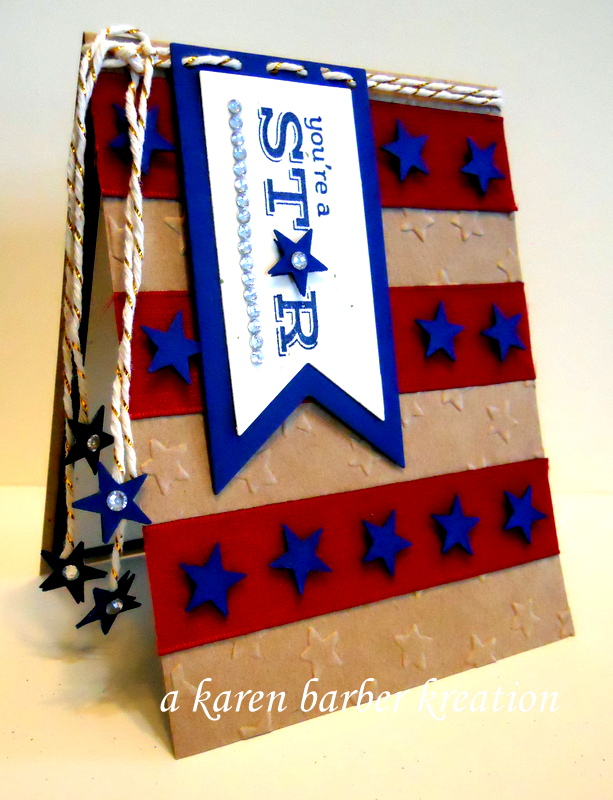 The SUO challenge this week made my LIPS FREEZE….Stars and Stripes….I had this embossing folder because I have to have every new embossing folder, but I just knew I didn’t even own a star stamp or a star punch. Can anyone relate to being a stamper so long you don’t even know what you have sometimes? Because I found the punch in like 60 seconds, and then I started looking thru my stamps to see if I had a Way to Go! stamp or something like that…..and I found this great YOU’RE A STAR stamp and knew at that point I was home free. 🙂 And I’m not gonna lie to ya, I kinda like this card!! It’s so not my usual….but I really like it!! I think it would make a great card for a soldier. Because they ARE STARS in my book, ya know? Go play in the challenge! I bet you can find some stars and stripes somewhere in your stash, ya think? Happy Tuesday everyone!! Thank GOD for our soldiers!! Until next time….Karen